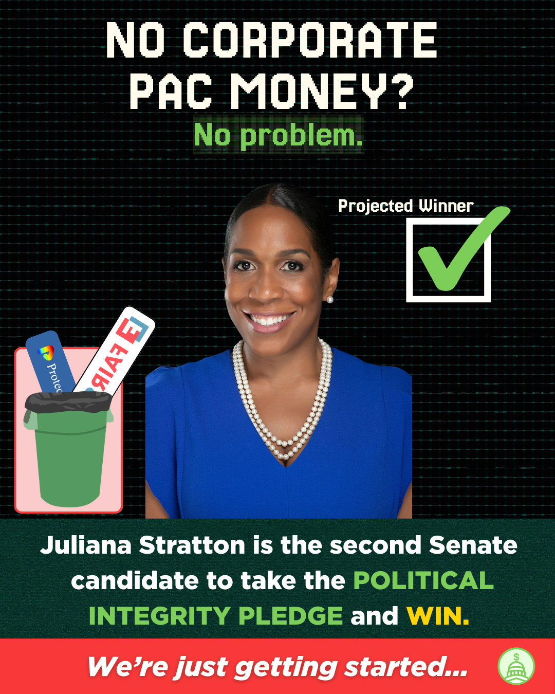 Juliana Stratton won the Democratic Senate primary, overcoming $10,000,000 in Crypto lobby money spent against her. She bested former Reps. Raja Krishnamoorthi and Robin Kelly. Both of her opponents have received hundreds of thousands of dollars in corporate PAC money while in office. Juliana has taken none.