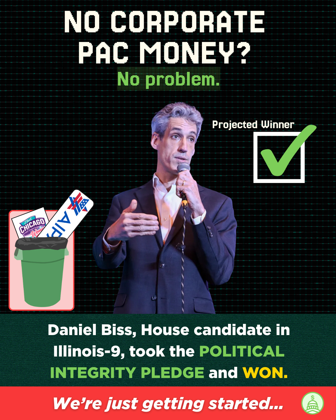 Daniel Biss won the Democratic primary for Illinois’ 9th House seat. He was up against Kat Abughazaleh, another candidate who took the pledge, and Laura Fine, a former state senator who was buoyed by $4,500,000 in outside spending from an AIPAC-front Super PAC, Elect Chicago Women. ECW went on to spend $1,400,000 in negative ads against Biss and another front organization, Chicago Progressive Partnership, spent $1,200,000 against Kat Abughazaleh.
