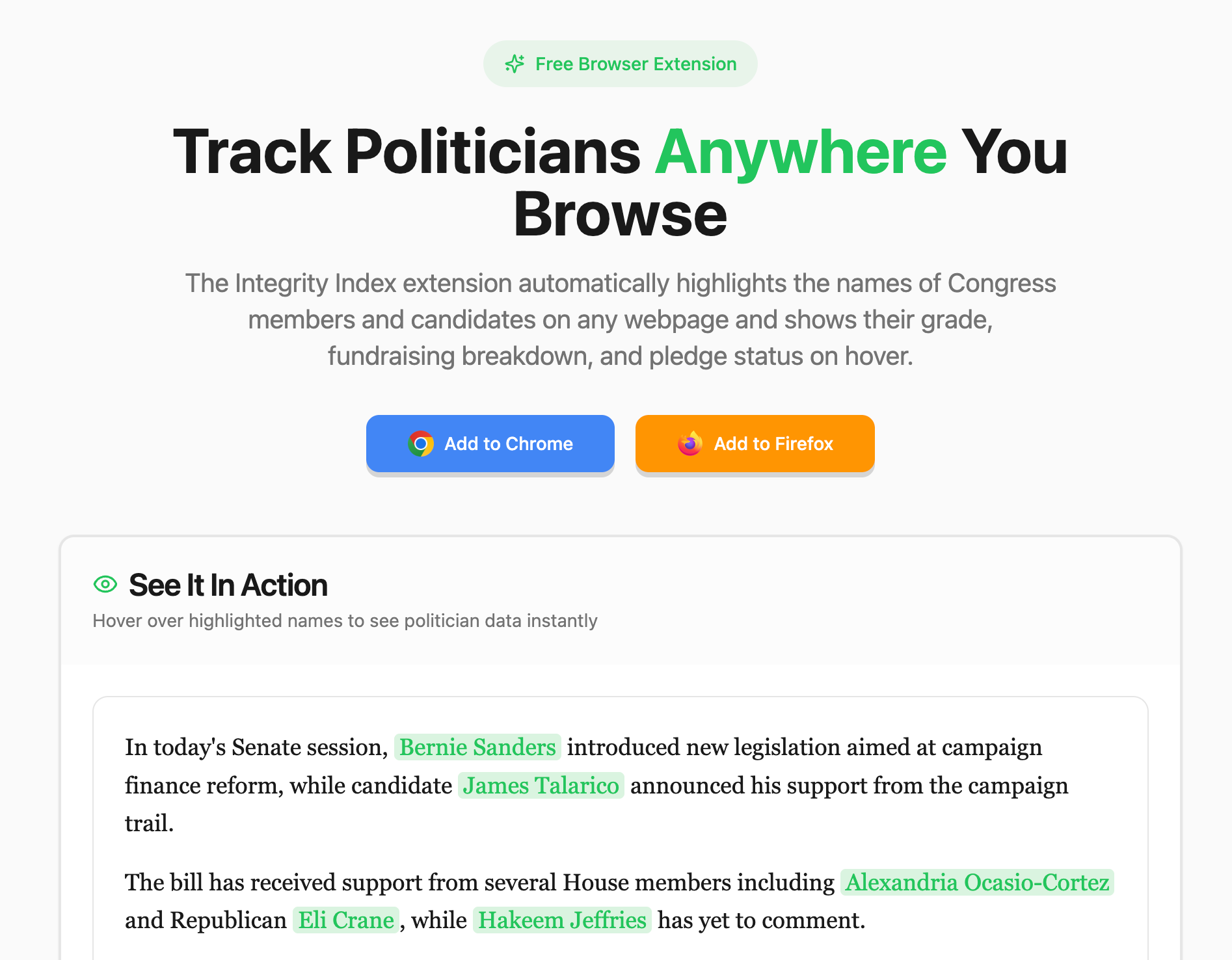 Once installed, a politician’s names will be highlighted green when they appear in an article, social media site, or anywhere online. If you hover over their name you will see a pop-up preview of all of their Integrity Index data.